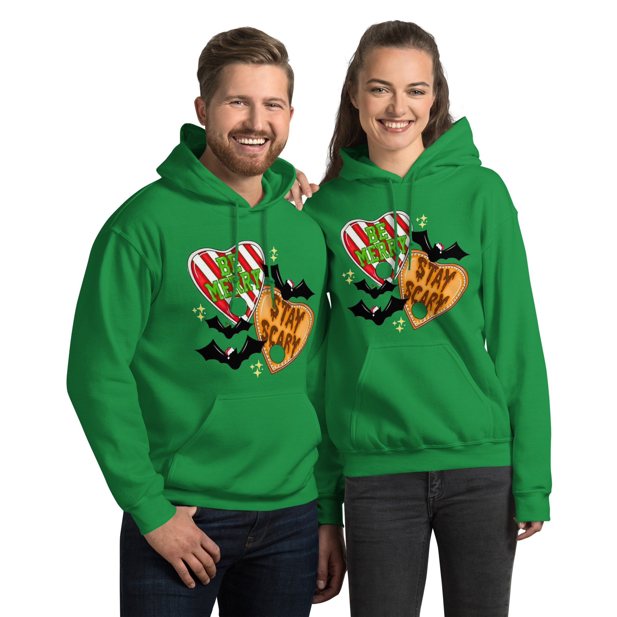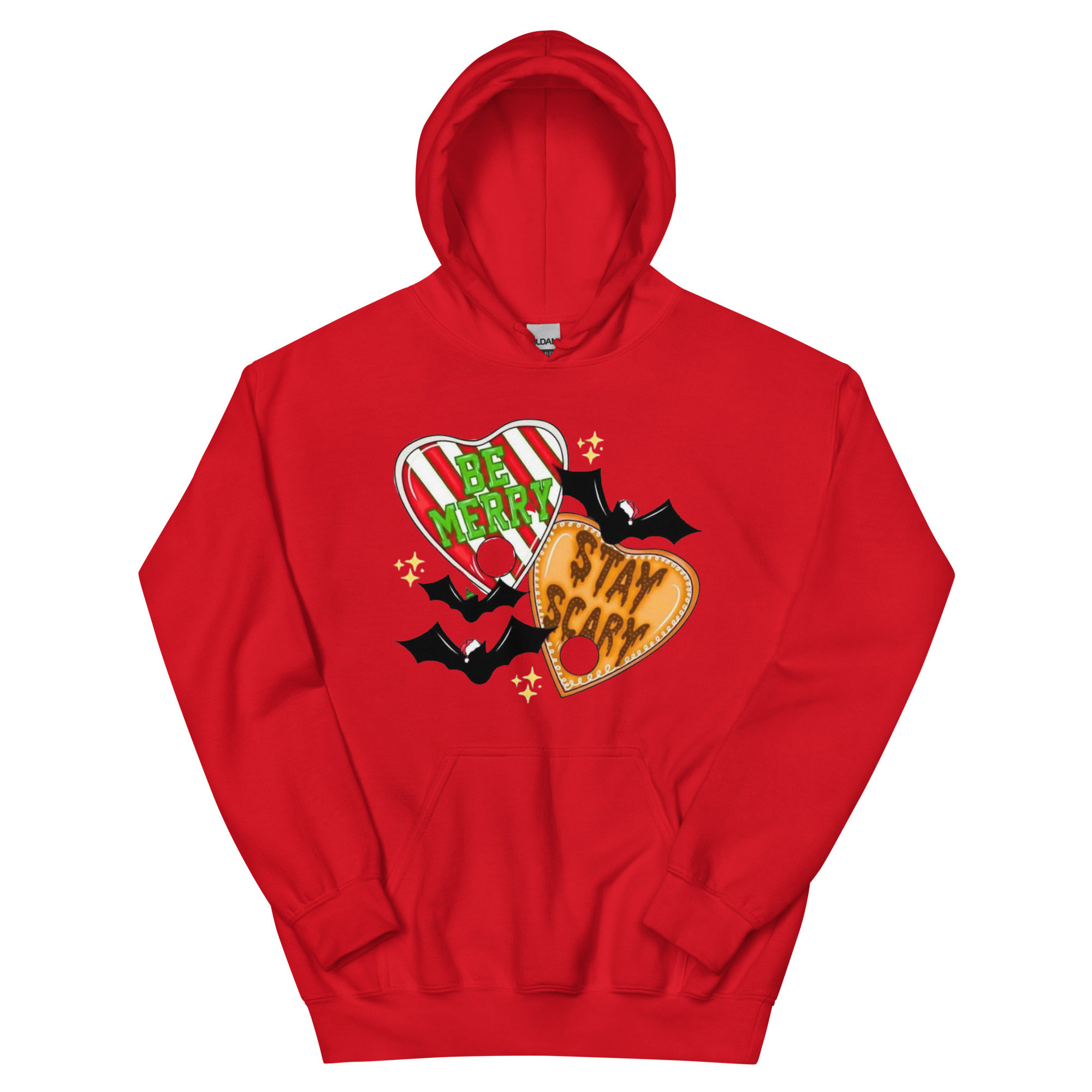 Blend spooky and festive vibes with this “Be Merry Stay Scary” hoodie featuring two bats in Christmas hats and a Ouija-style planchette. Cozy, soft, and perfect for anyone who loves creepy-cute holiday mashups. Great for gothic Christmas style, spooky-season fans, winter lounging, and unique holiday gifting.