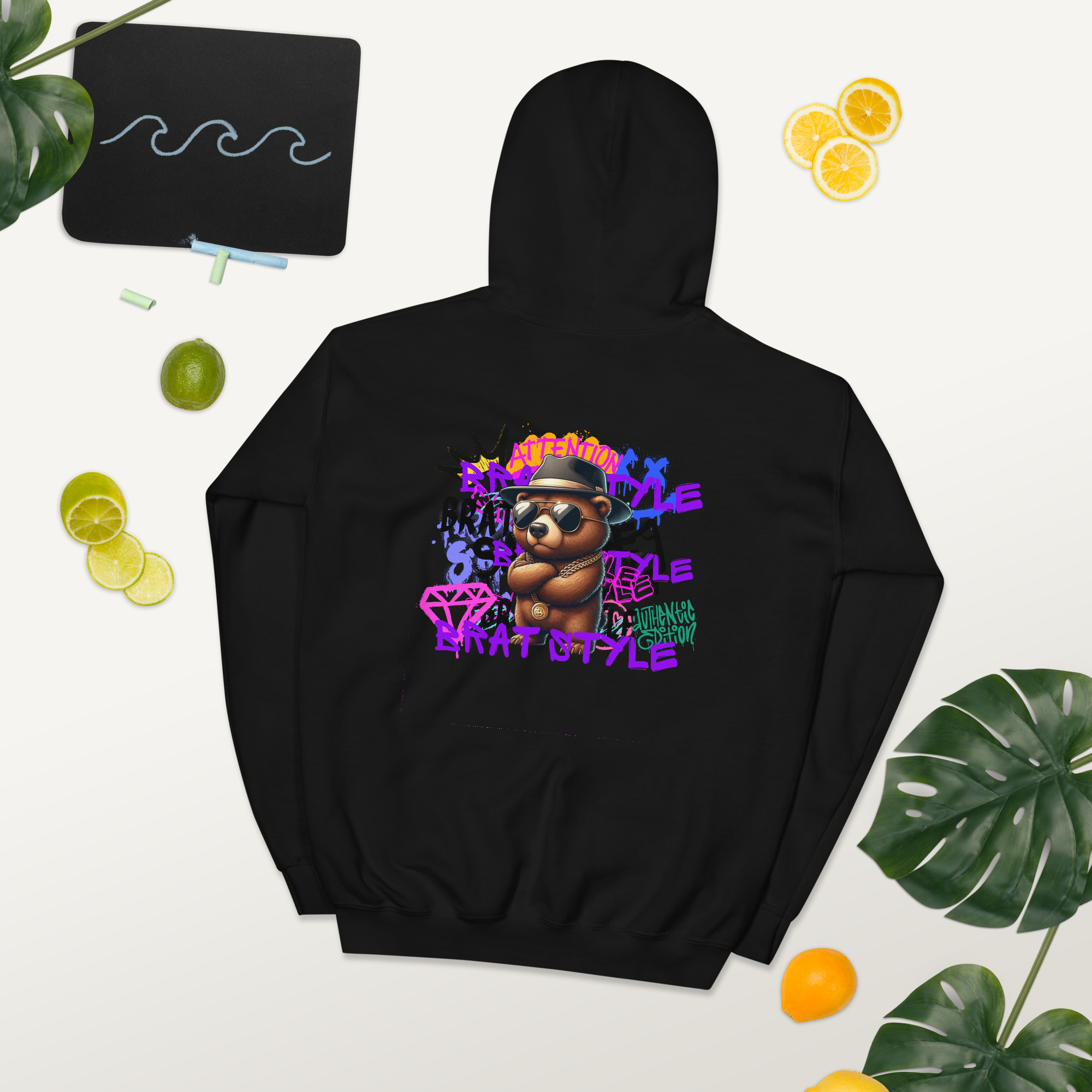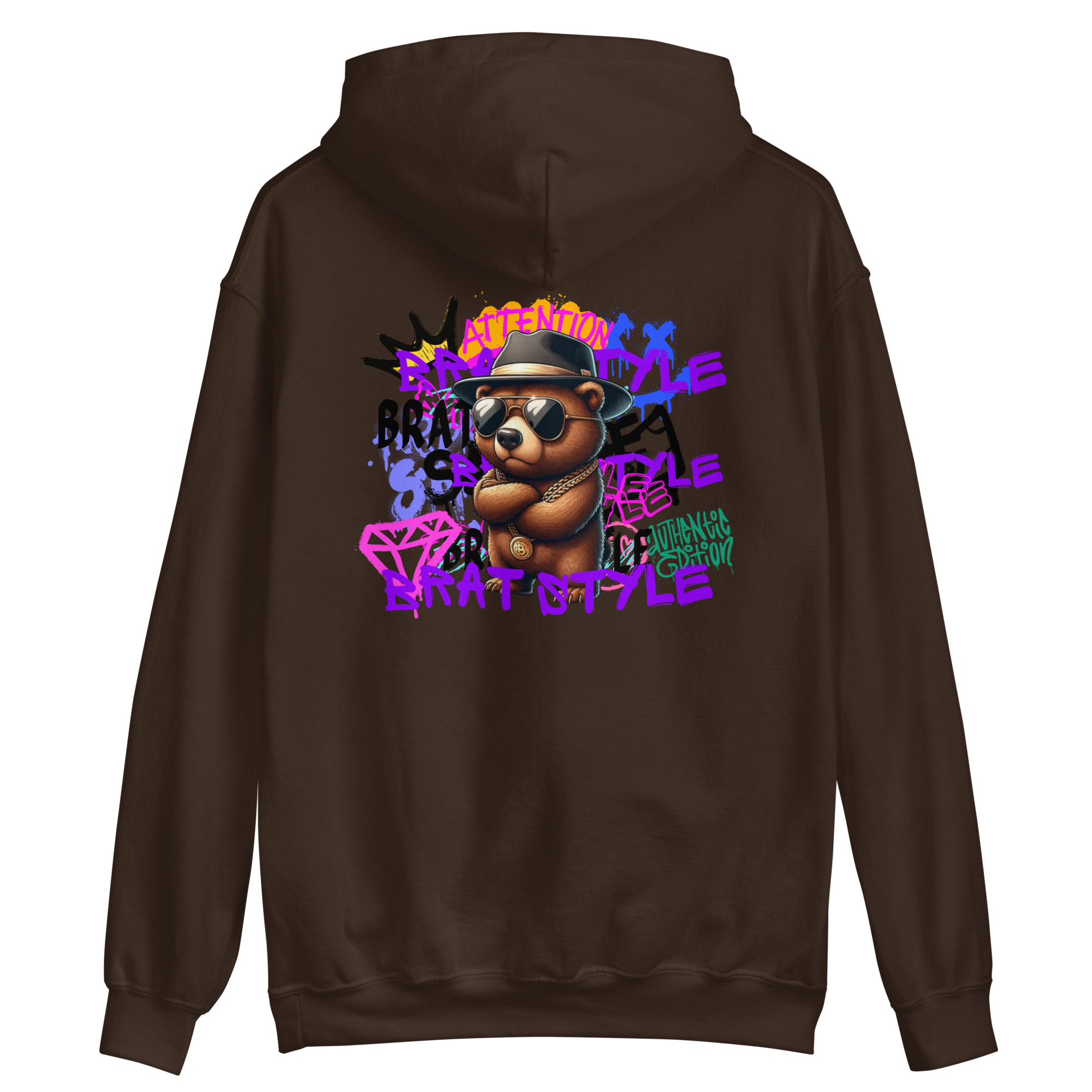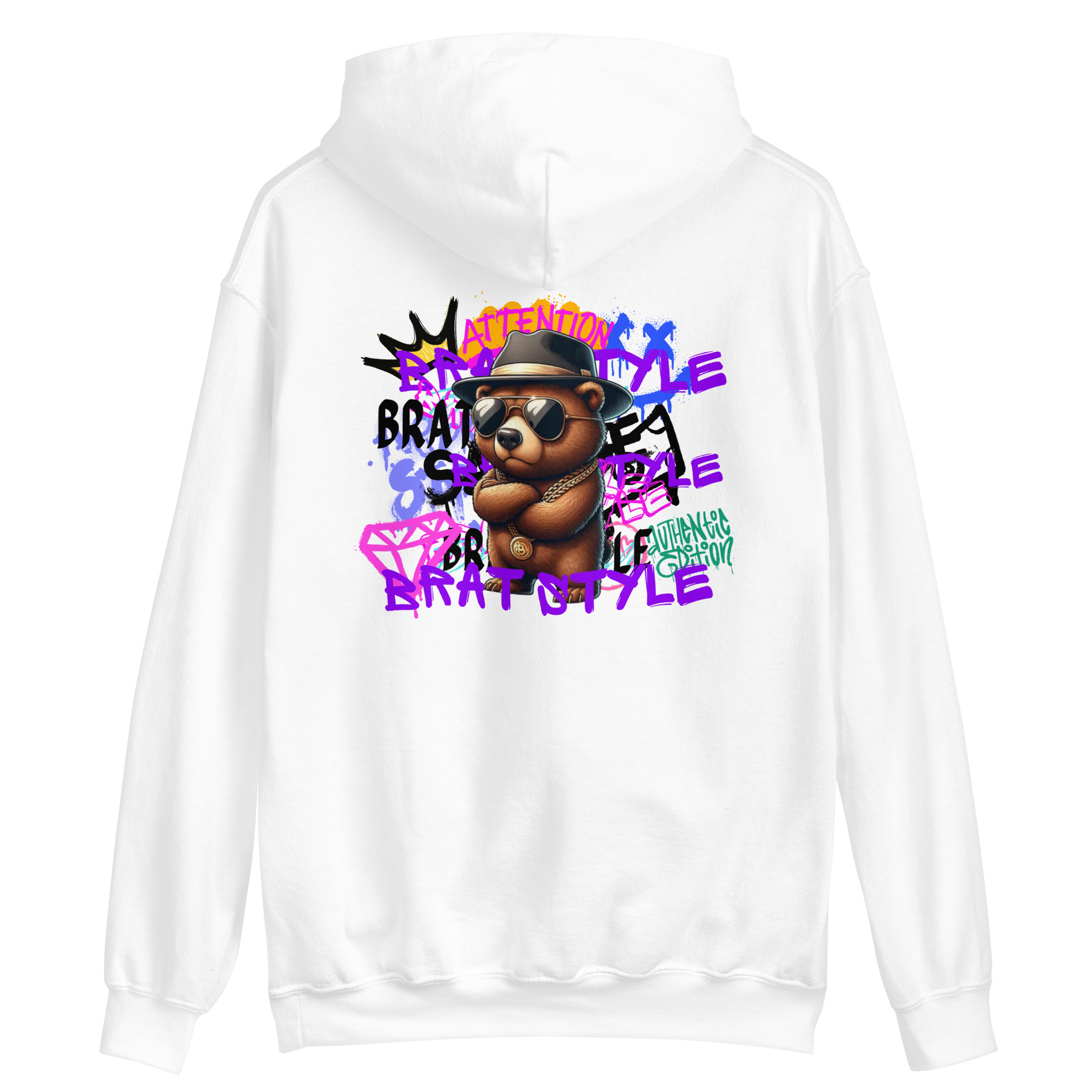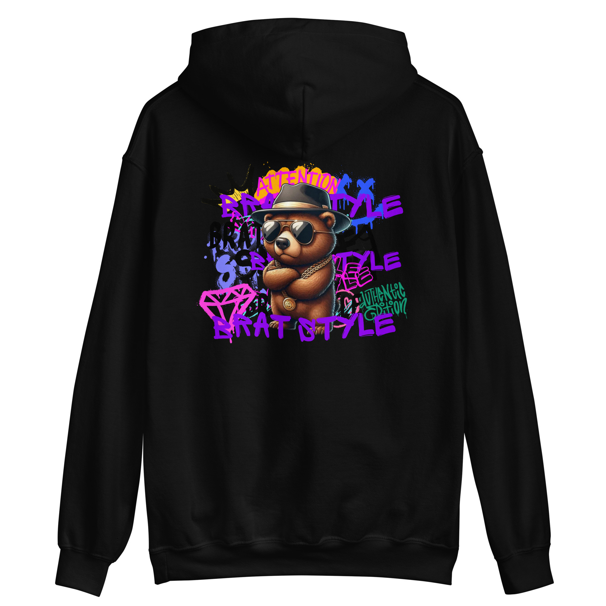 Elevate your streetwear game with the Brat Style Graffiti Unisex Hoodie. This premium hoodie isn't just clothing; it's a statement. Featuring a captivating image of a shades-wearing teddy bear against a backdrop of vibrant Brat Style graffiti, this hoodie embodies urban cool and effortless style. Crafted for both men and women, its unisex design offers a comfortable, relaxed fit perfect for any occasion.