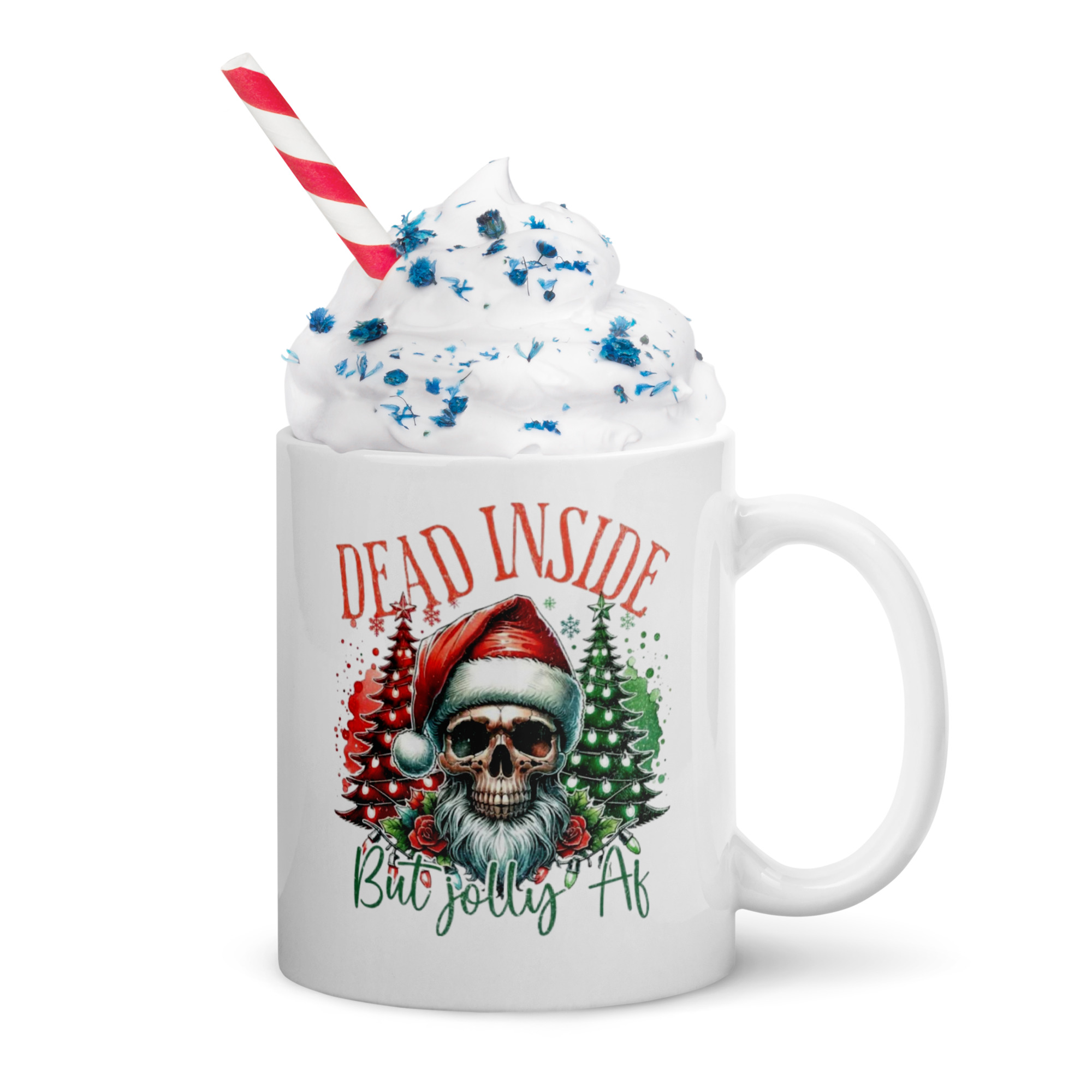 White ceramic glossy mug with “Dead Inside But Jolly” graphic