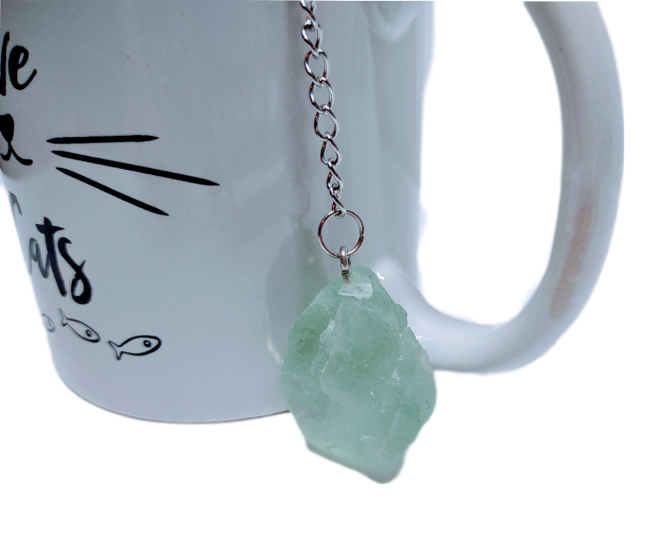 Crafted from a raw, unfinished green fluorite stone, each tea basket boasts a distinctive natural charm. The stone is securely attached to a fine stainless steel chain, leading to a robust brewing ball designed to hold your tea leaves. This allows for optimal infusion while preventing stray leaves from escaping into your cup. The delicate balance of natural and refined elements adds a touch of tranquility to your tea time.