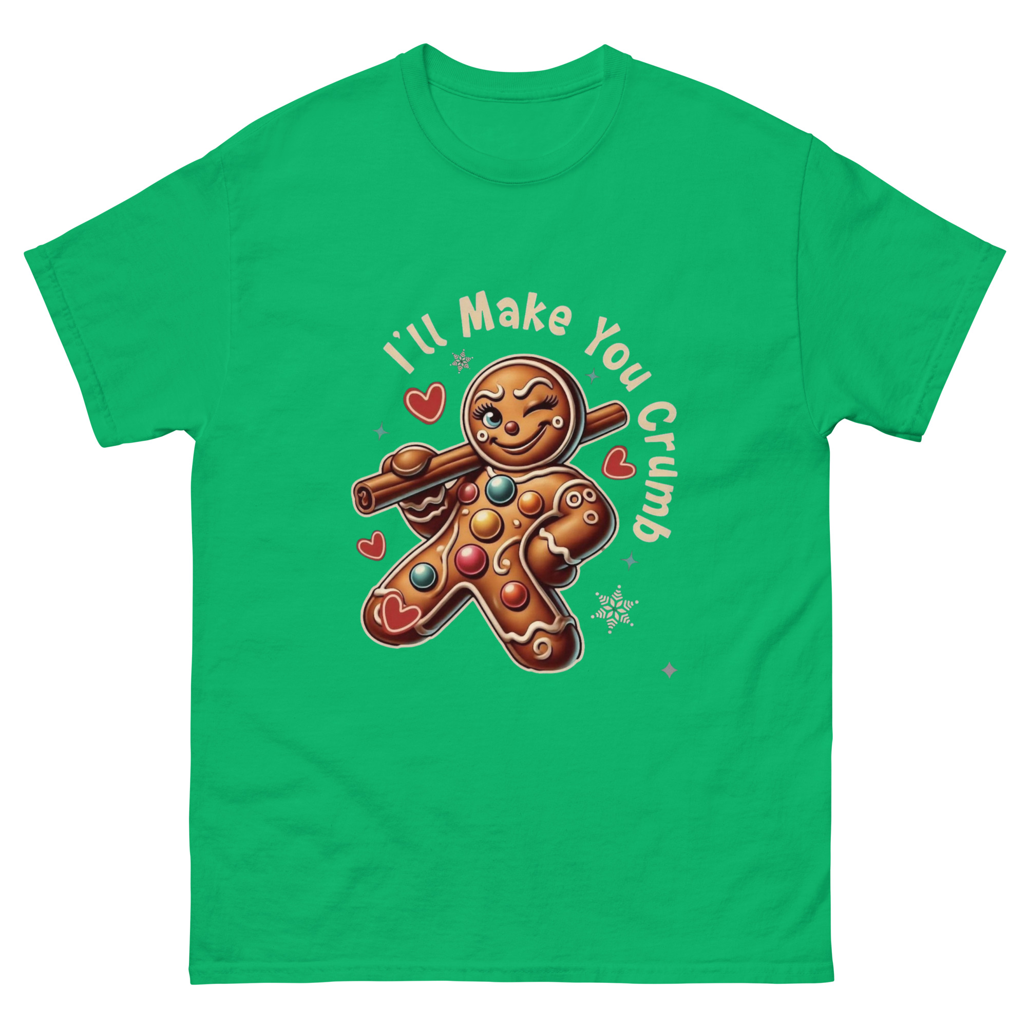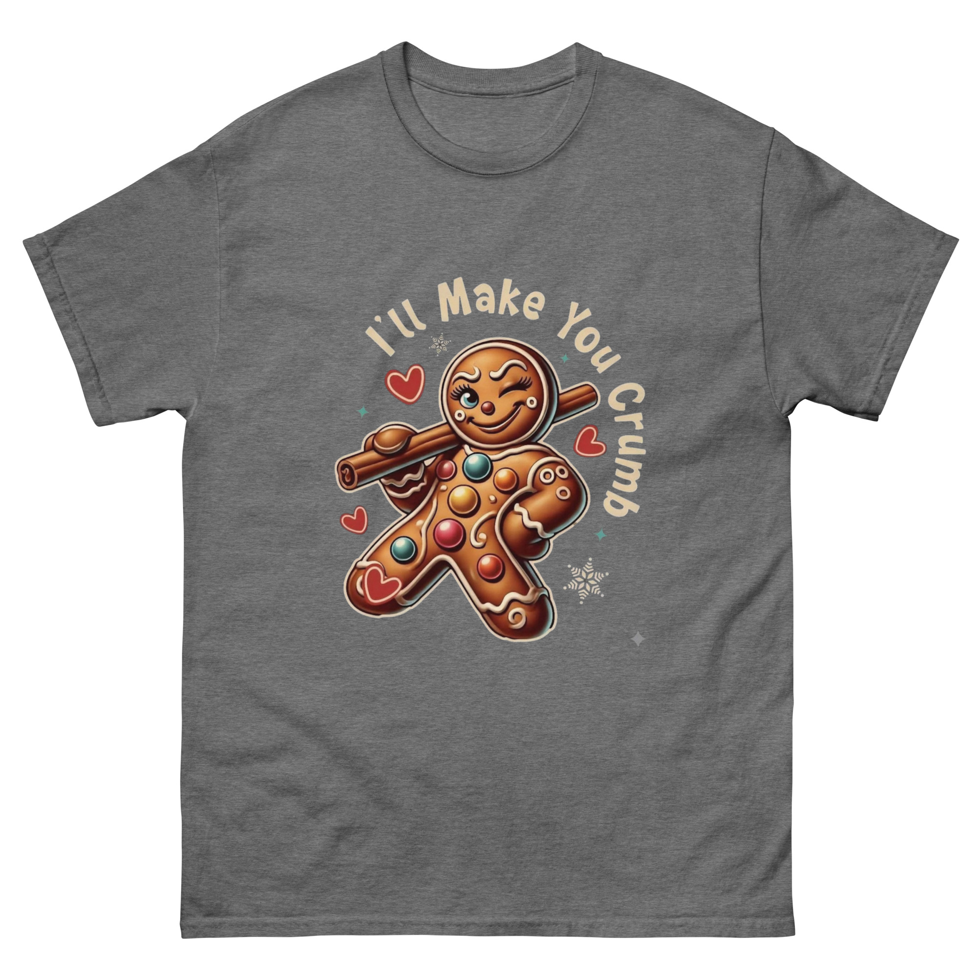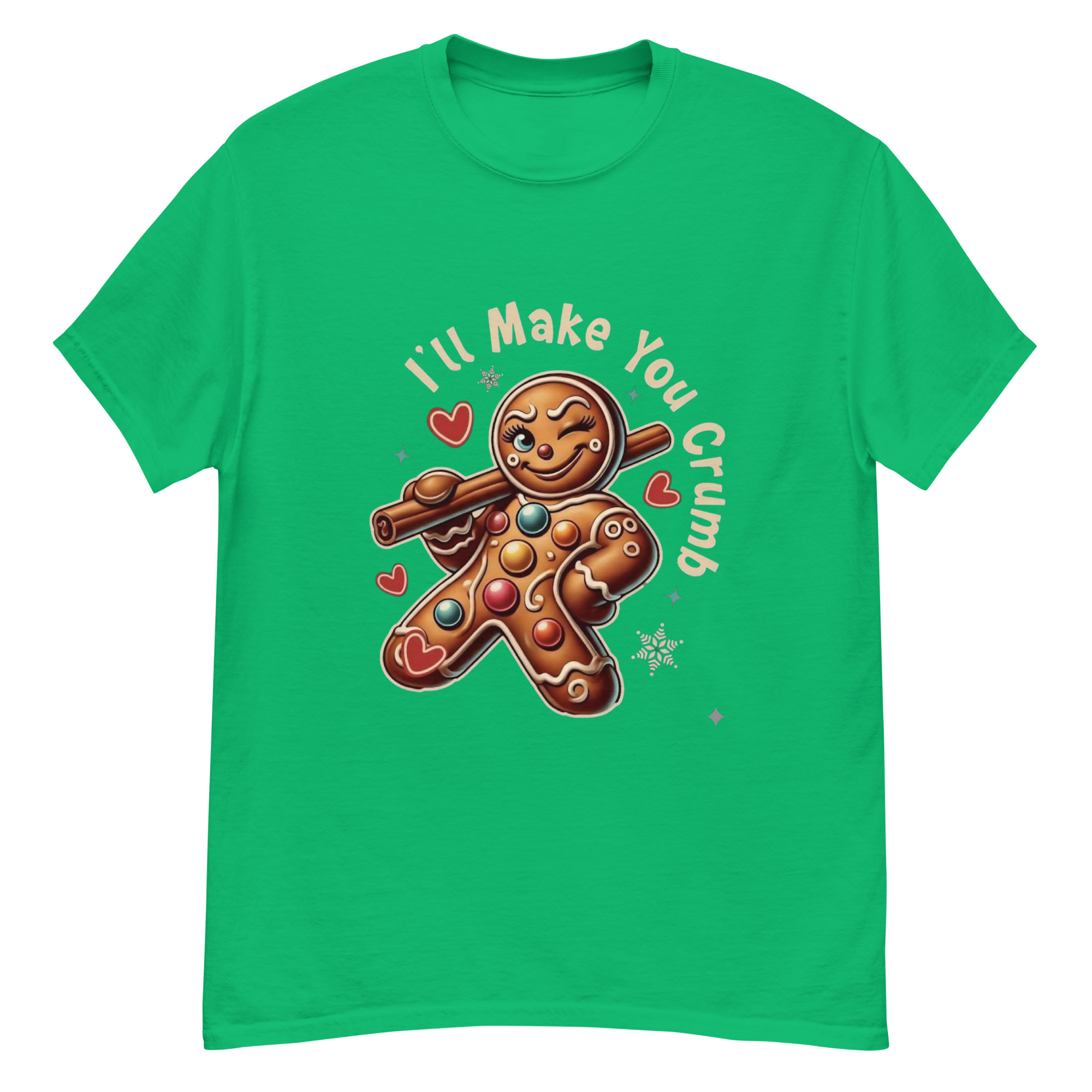 A unisex t-shirt featuring a playful female gingerbread cookie holding a cinnamon stick like a baseball bat with the phrase “I’ll Make You Crumb.” This fun and cheeky holiday design is perfect for anyone who loves whimsical, humorous Christmas apparel. Soft and comfortable, it works great for casual holiday outfits, gifting, or adding a little festive sass to your wardrobe.