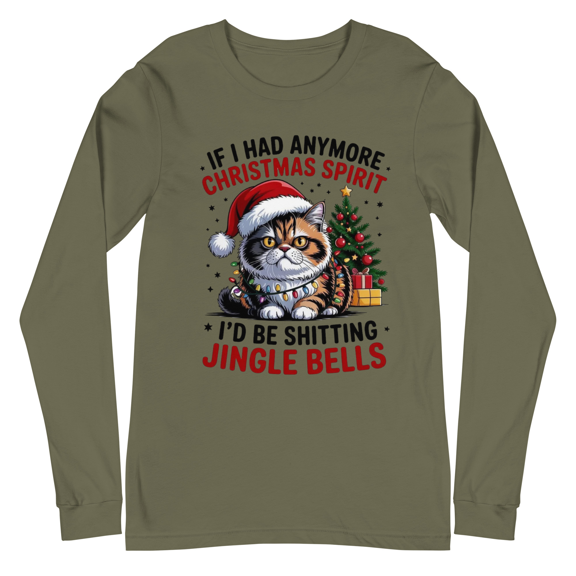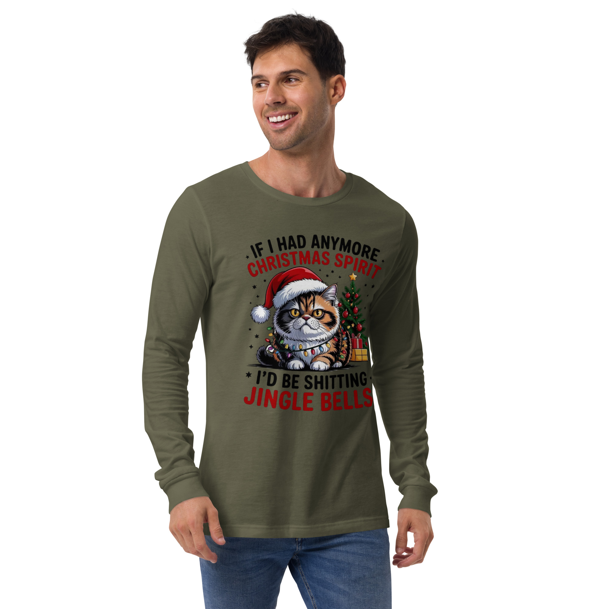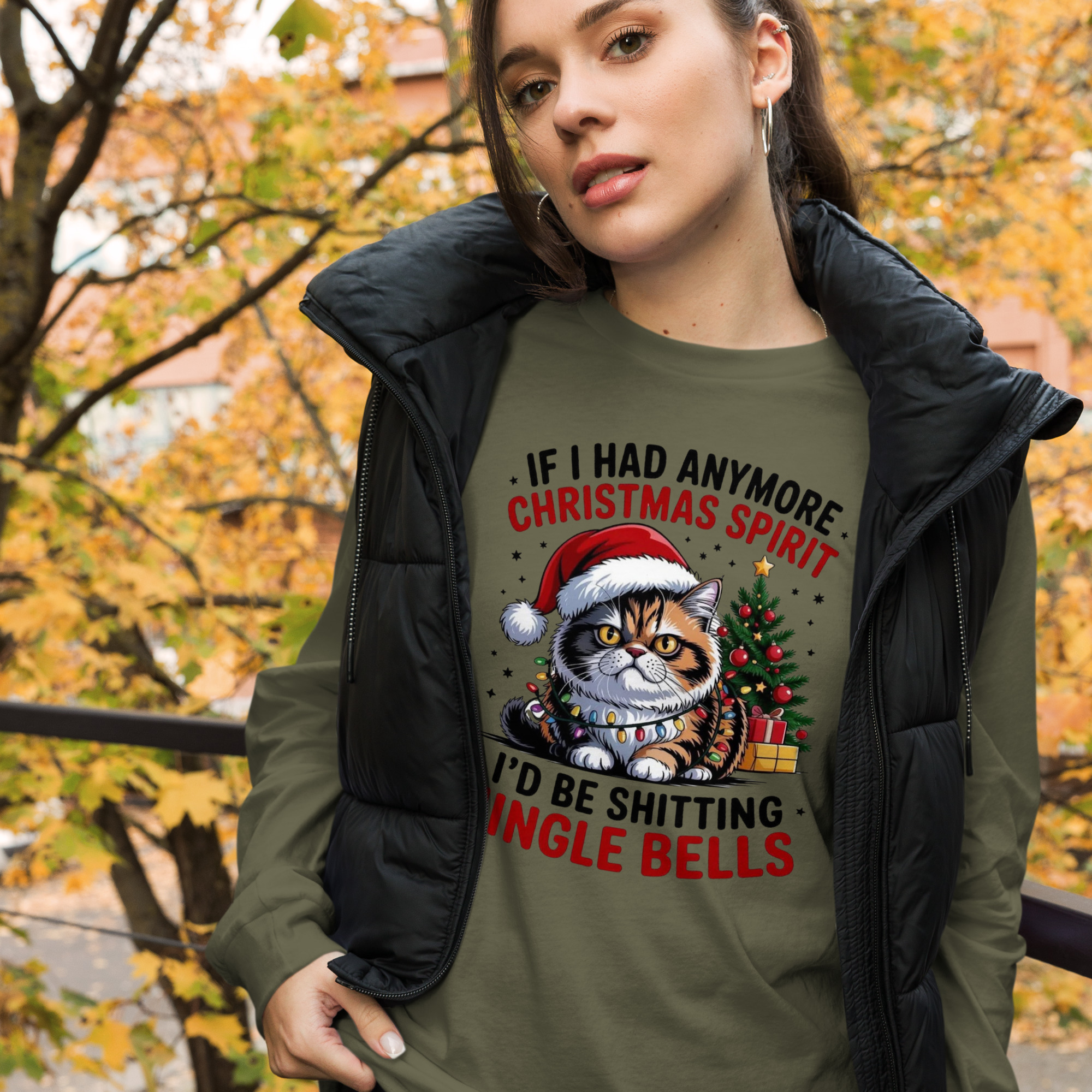 A unisex long sleeve t-shirt featuring a grumpy Christmas-themed cat and the cheeky phrase, “If I had any more Christmas spirit I’d be shitting jingle bells.” Perfect for fans of humorous, adult holiday apparel who enjoy playful sarcasm with a festive twist. Soft, comfortable, and warm, this shirt is ideal for winter gatherings, holiday parties, or as a fun gift for friends and family with a dark sense of humor.