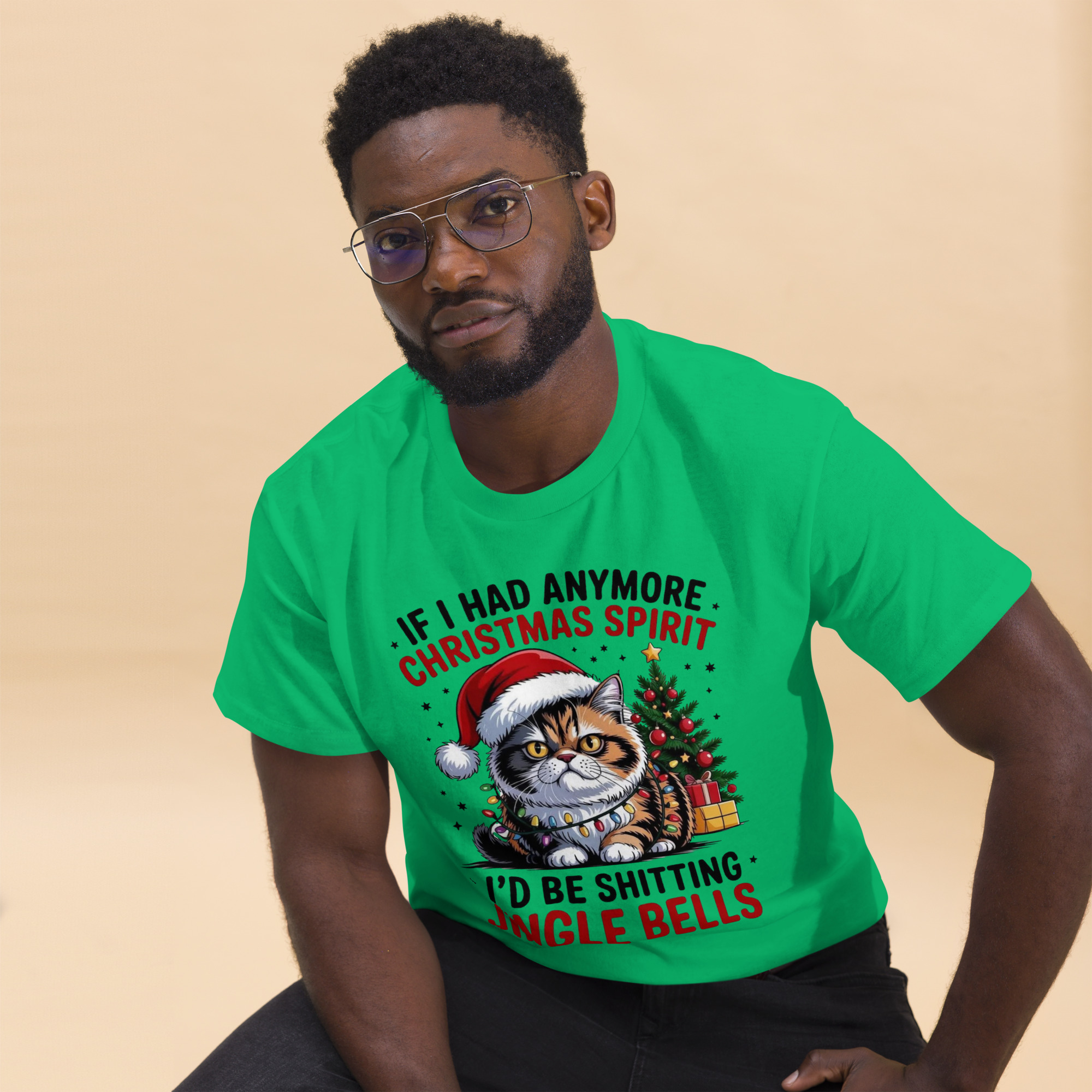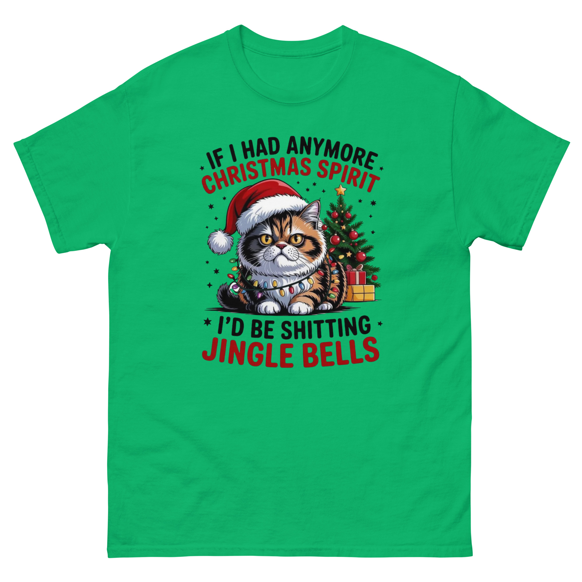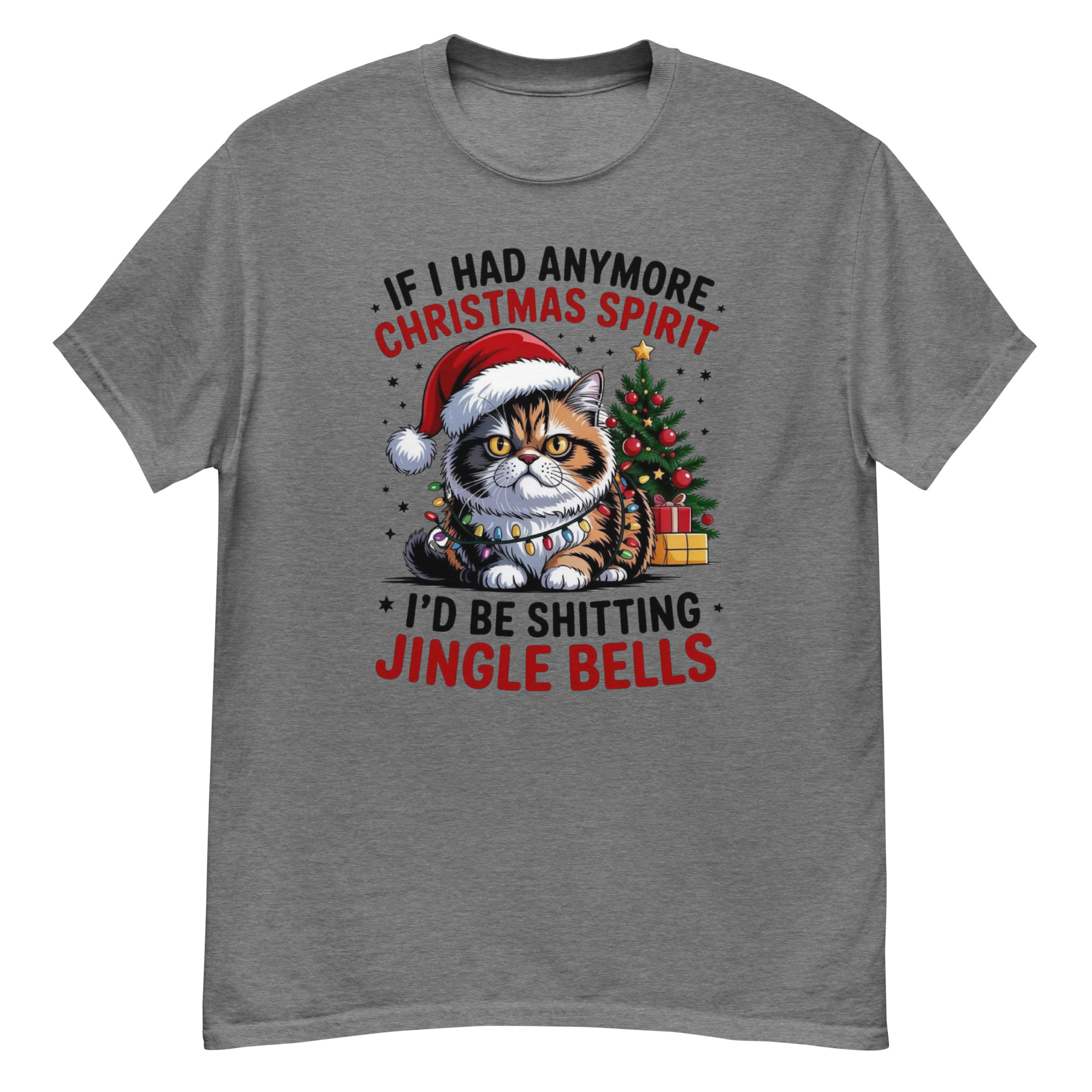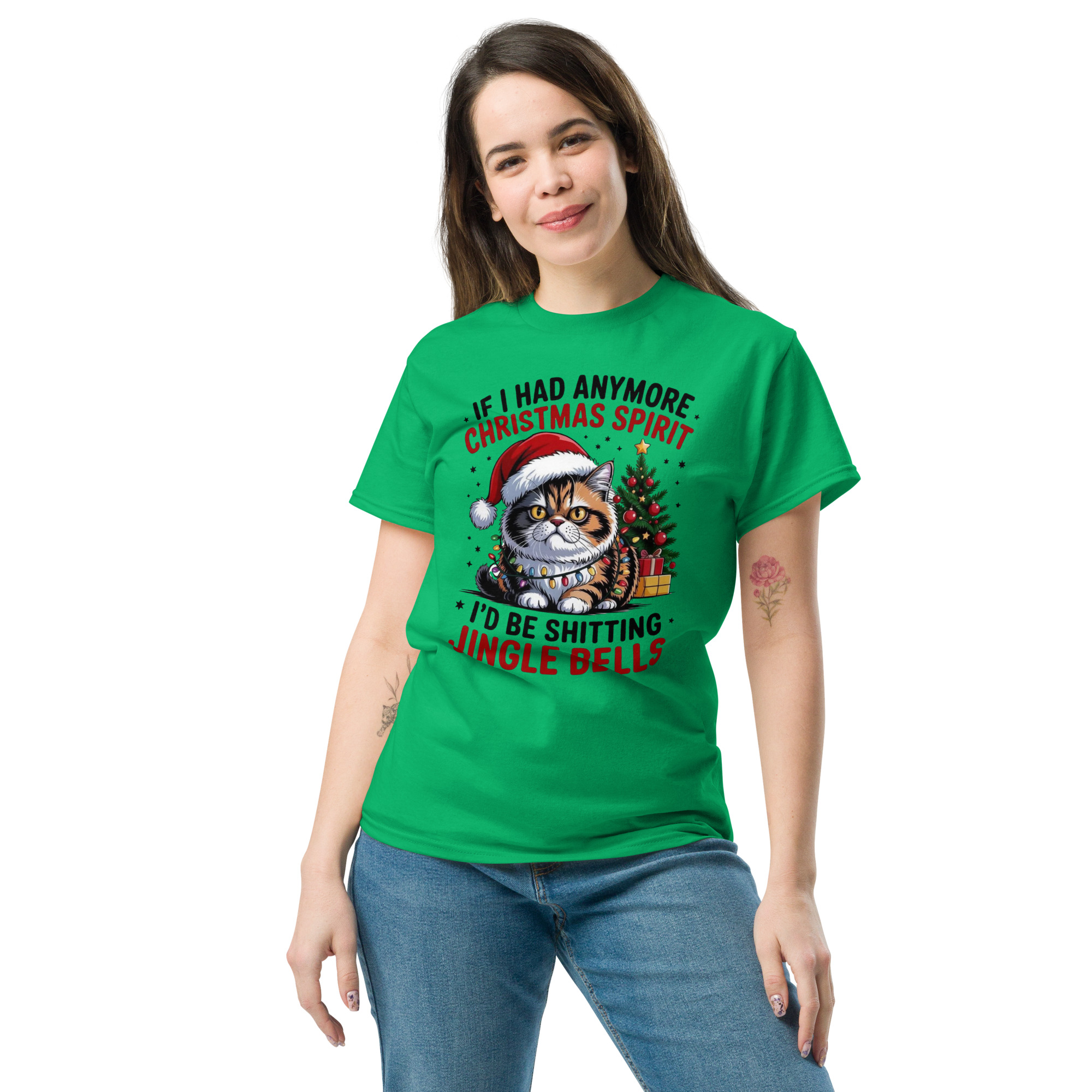 A unisex t-shirt featuring a grumpy Christmas-themed cat and the playful phrase, “If I had any more Christmas spirit I’d be shitting jingle bells.” Perfect for fans of humorous, adult holiday apparel who enjoy festive sarcasm. Soft, comfortable, and durable, this tee works for holiday parties, casual winter wear, or as a fun gift for friends and family who love quirky holiday humor.
