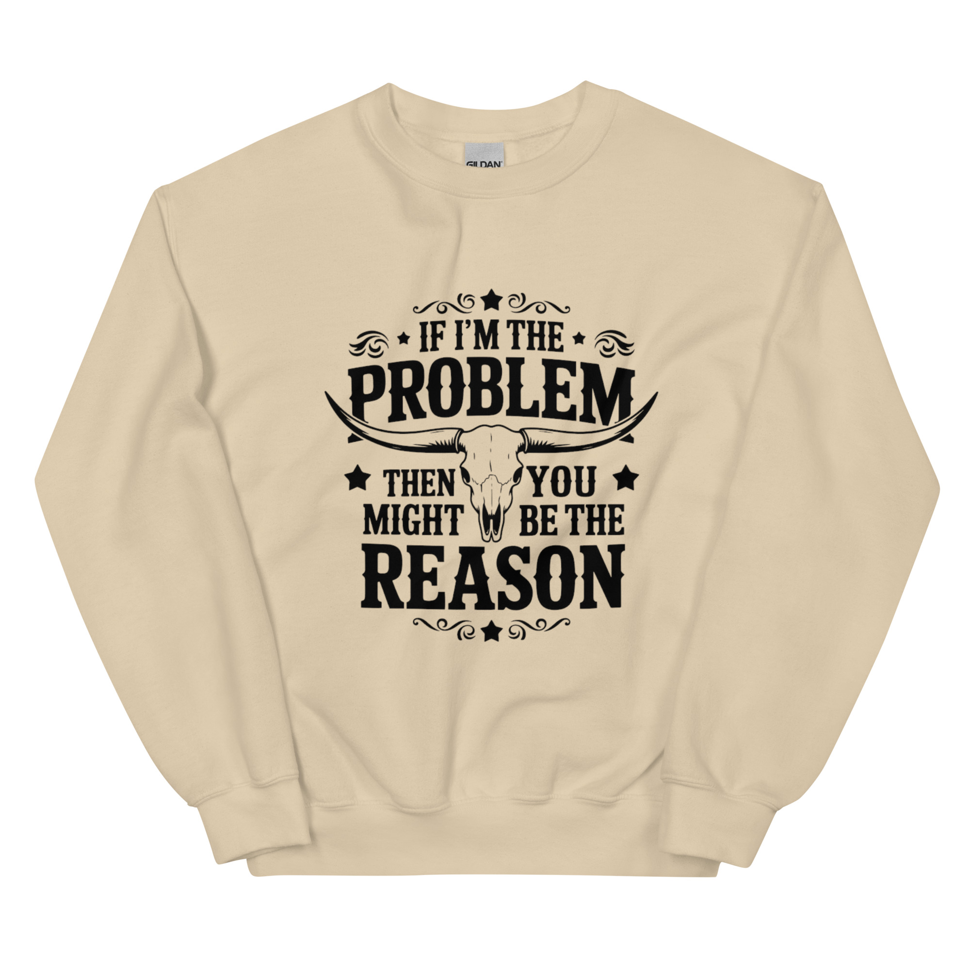 This tan crew neck sweatshirt features the bold phrase “If I’m the Problem, You Might Be the Reason” paired with a clean graphic design that delivers just the right amount of attitude. It’s sarcastic, self-aware, and perfect for anyone who’s tired of being labeled “the problem.”
