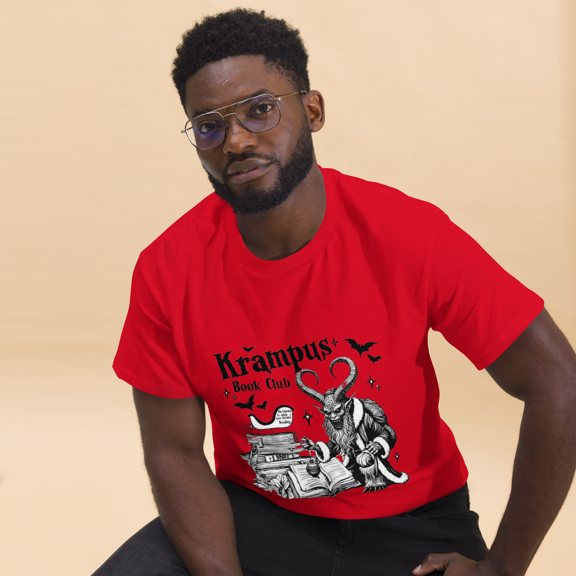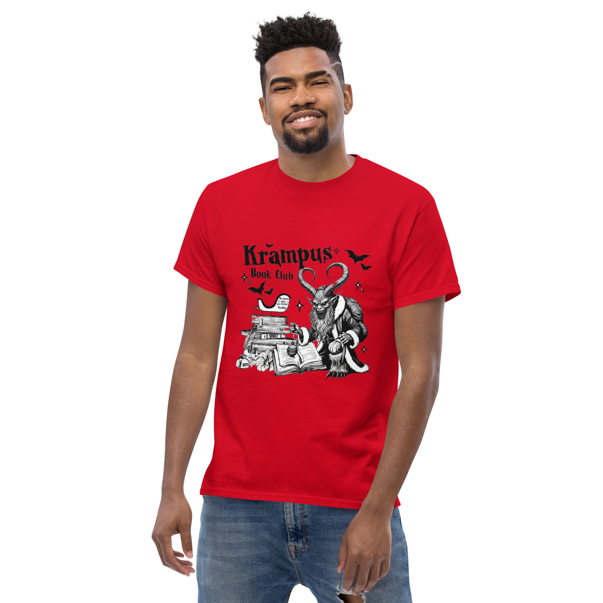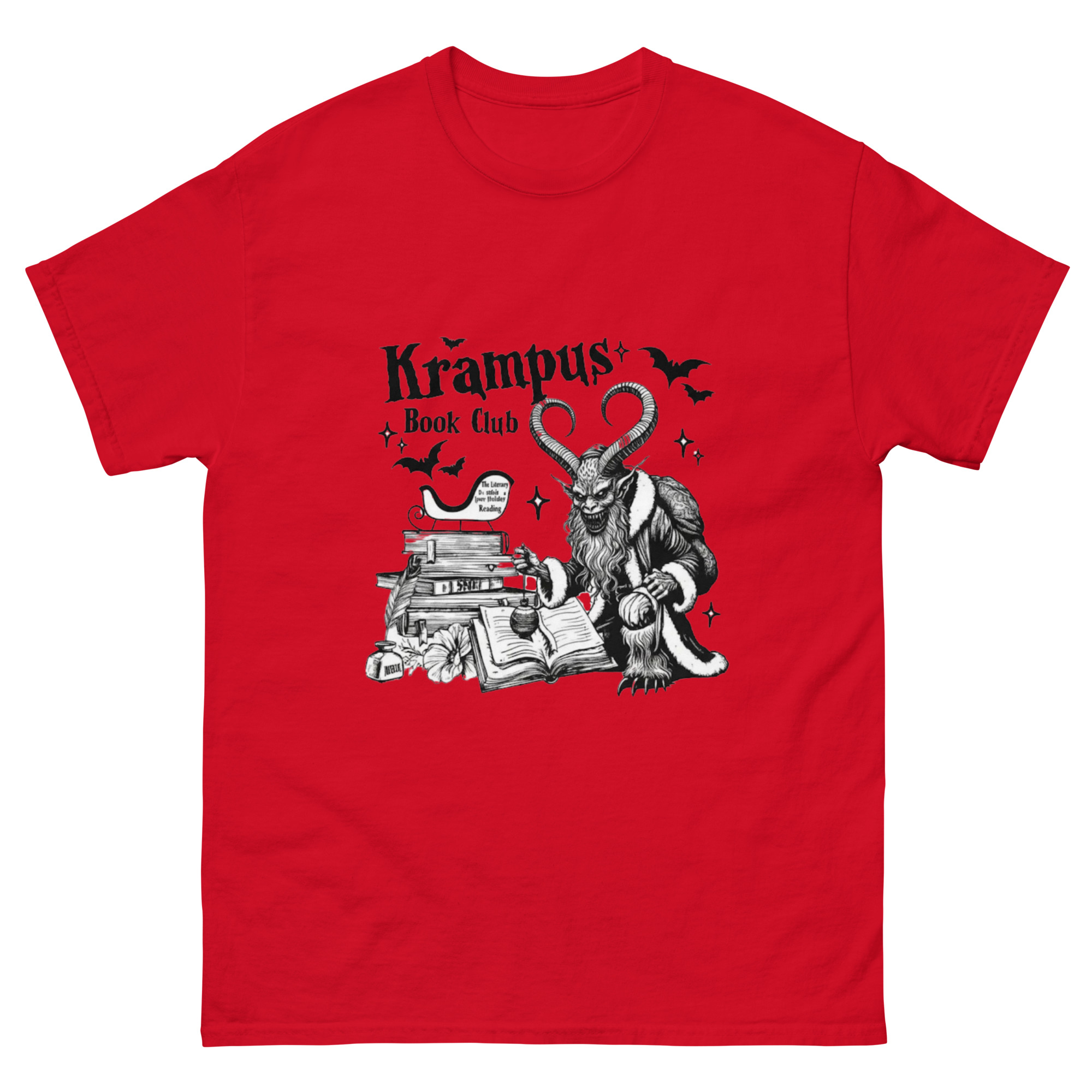 A unisex t-shirt featuring a playful Krampus holding a stack of books with the phrase “Krampus Book Club.” Perfect for fans of dark humor, holiday mischief, or book-loving adults who enjoy a twist on traditional Christmas designs. Soft, comfortable, and durable, this shirt is ideal for holiday parties, casual wear, or as a unique gift for bookworms and Krampus enthusiasts.