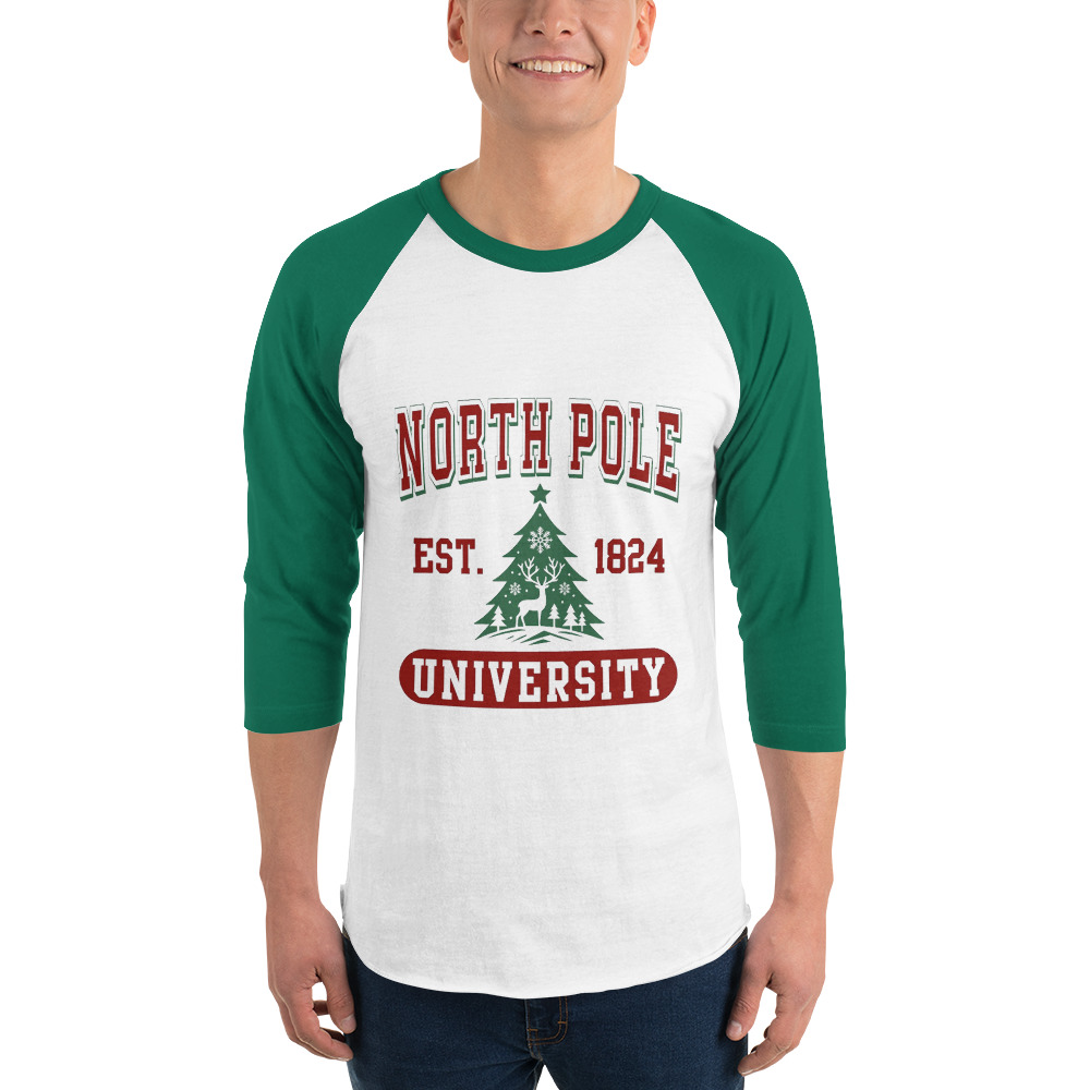 North Pole University 3/4 Sleeve Raglan Shirt — Unisex Holiday Tee