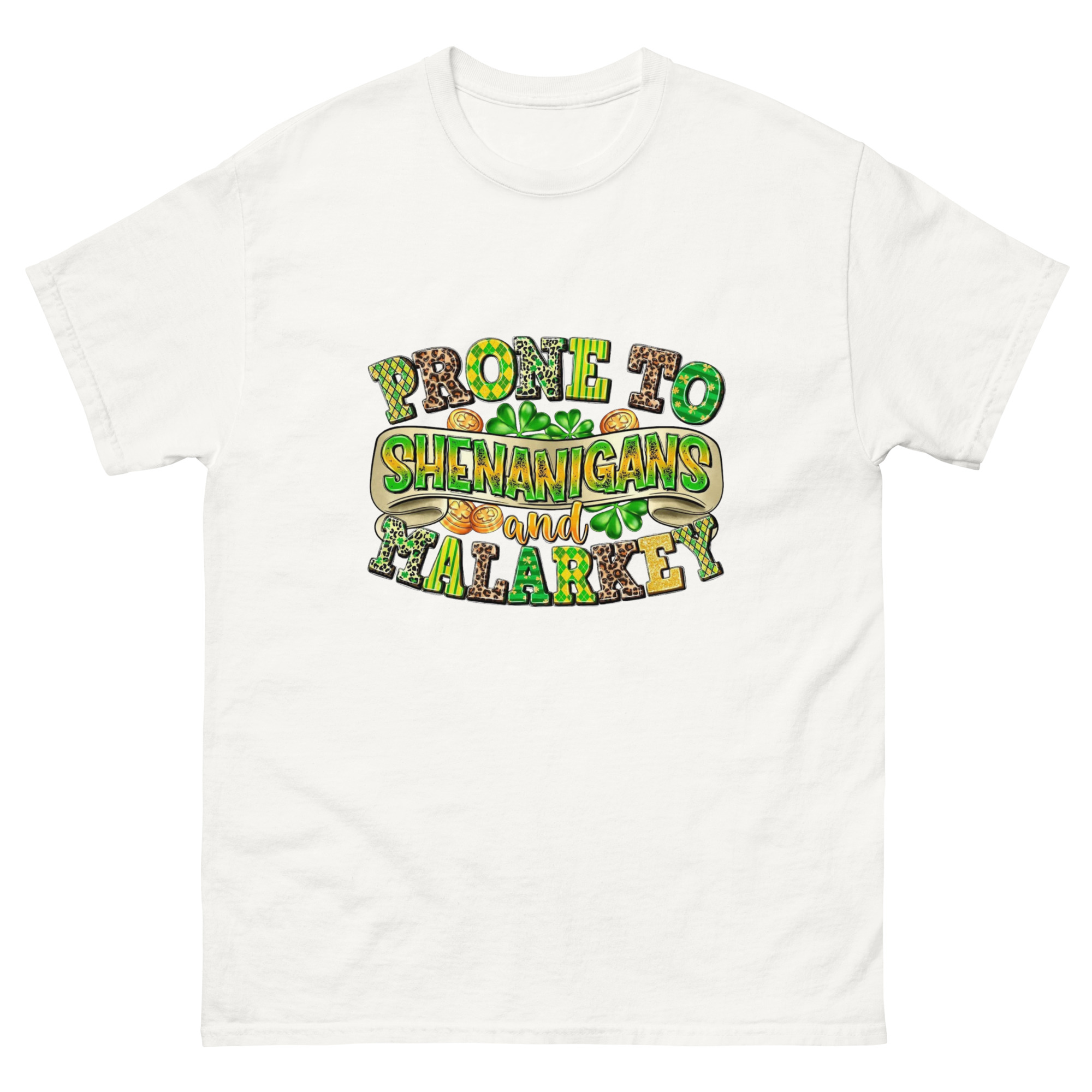 Embrace the spirit of St. Patrick's Day with our "Prone to Shenanigans" Unisex Classic Tee. This comfortable and stylish tee is perfect for celebrating all things Irish, whether you're indulging in a bit of malarkey or simply enjoying the festive atmosphere. Crafted from high-quality, soft material, this tee offers a comfortable fit that's perfect for all-day wear. Its classic unisex design complements any style, making it a versatile addition to your wardrobe.