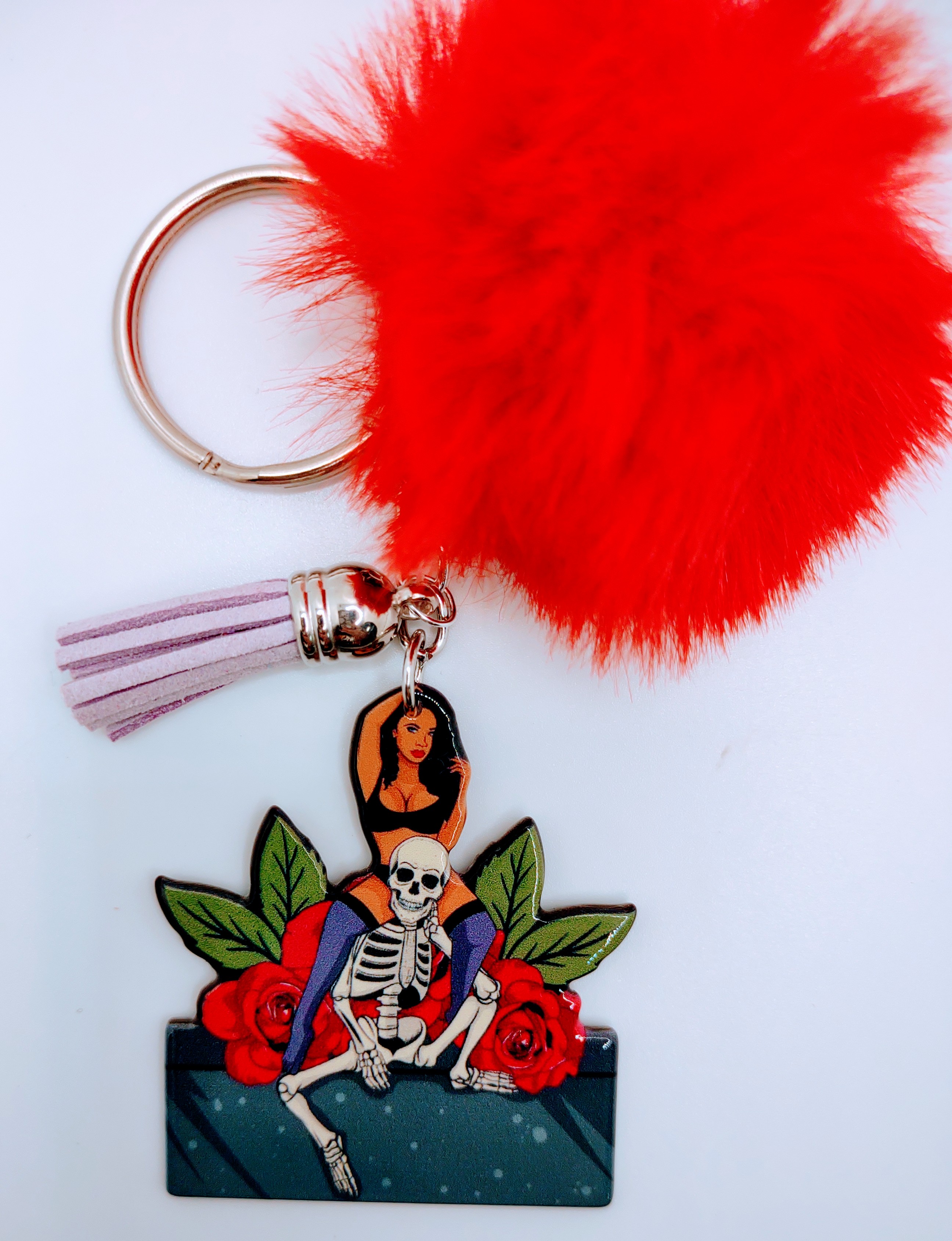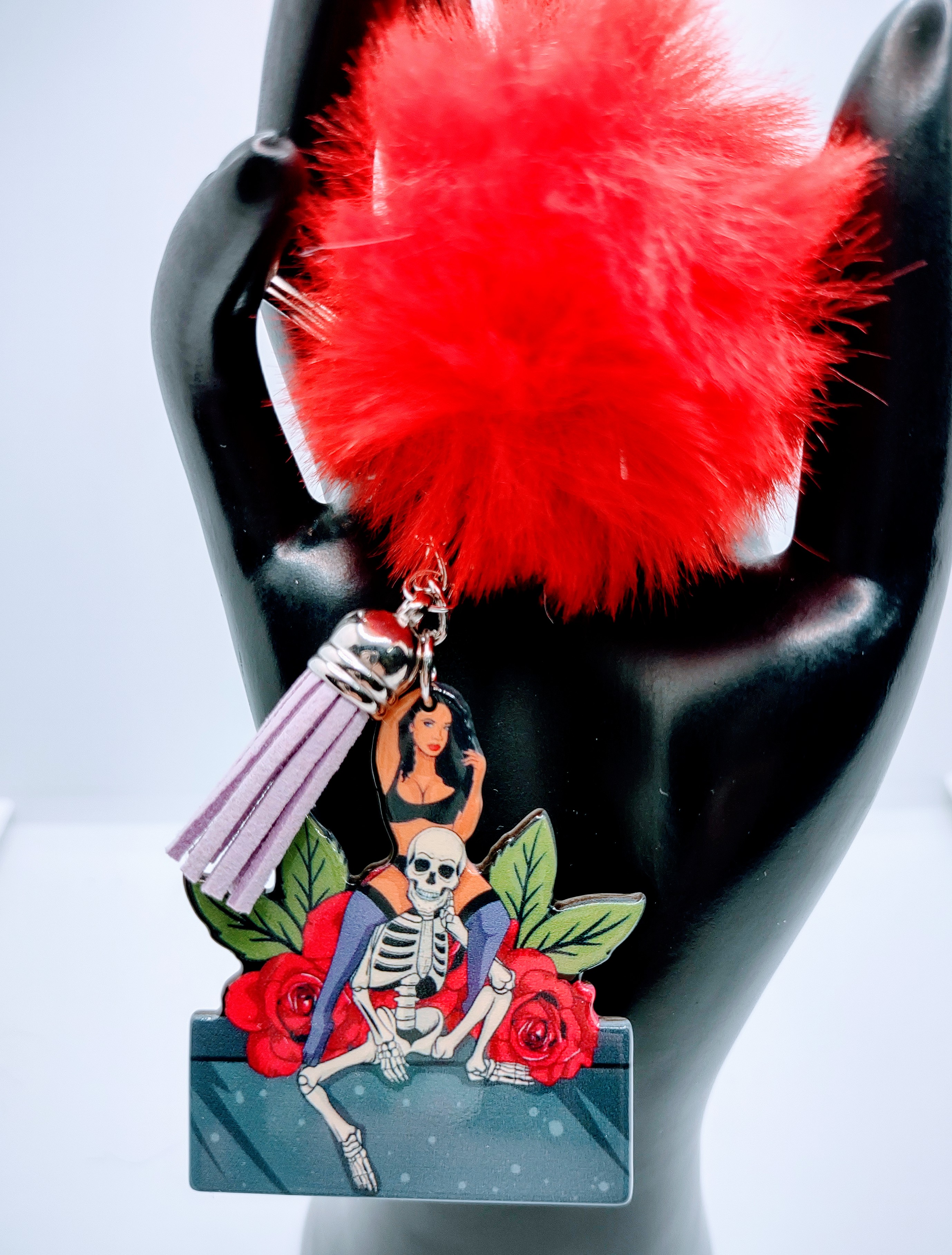 Add a touch of dark romance and whimsy to your everyday essentials with the Rose Love Acrylic Keychain. This unique accessory features a captivating rose-covered image of a sexy lady on the shoulders of her skeleton lover, encased in premium acrylic. Perfect for adding a touch of individuality to your keys, bag, or backpack, this keychain is a conversation starter and a statement piece.
