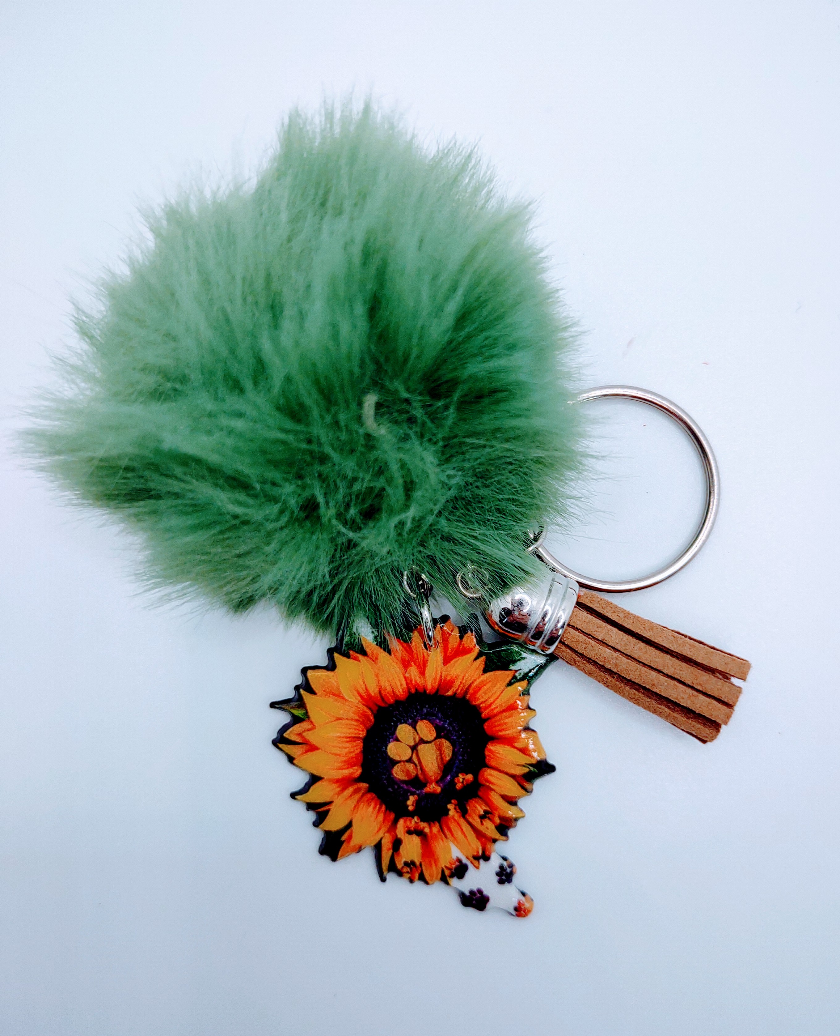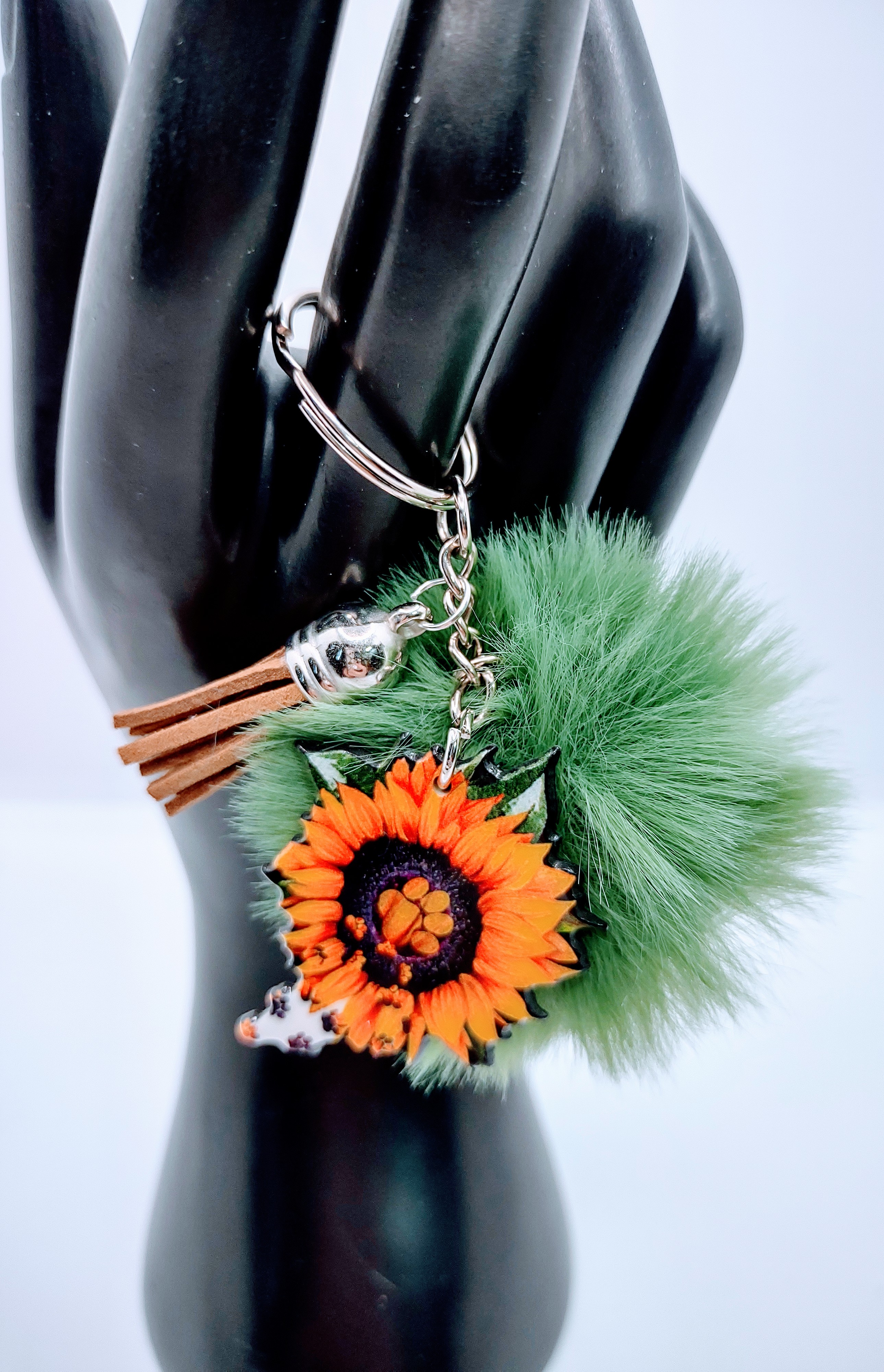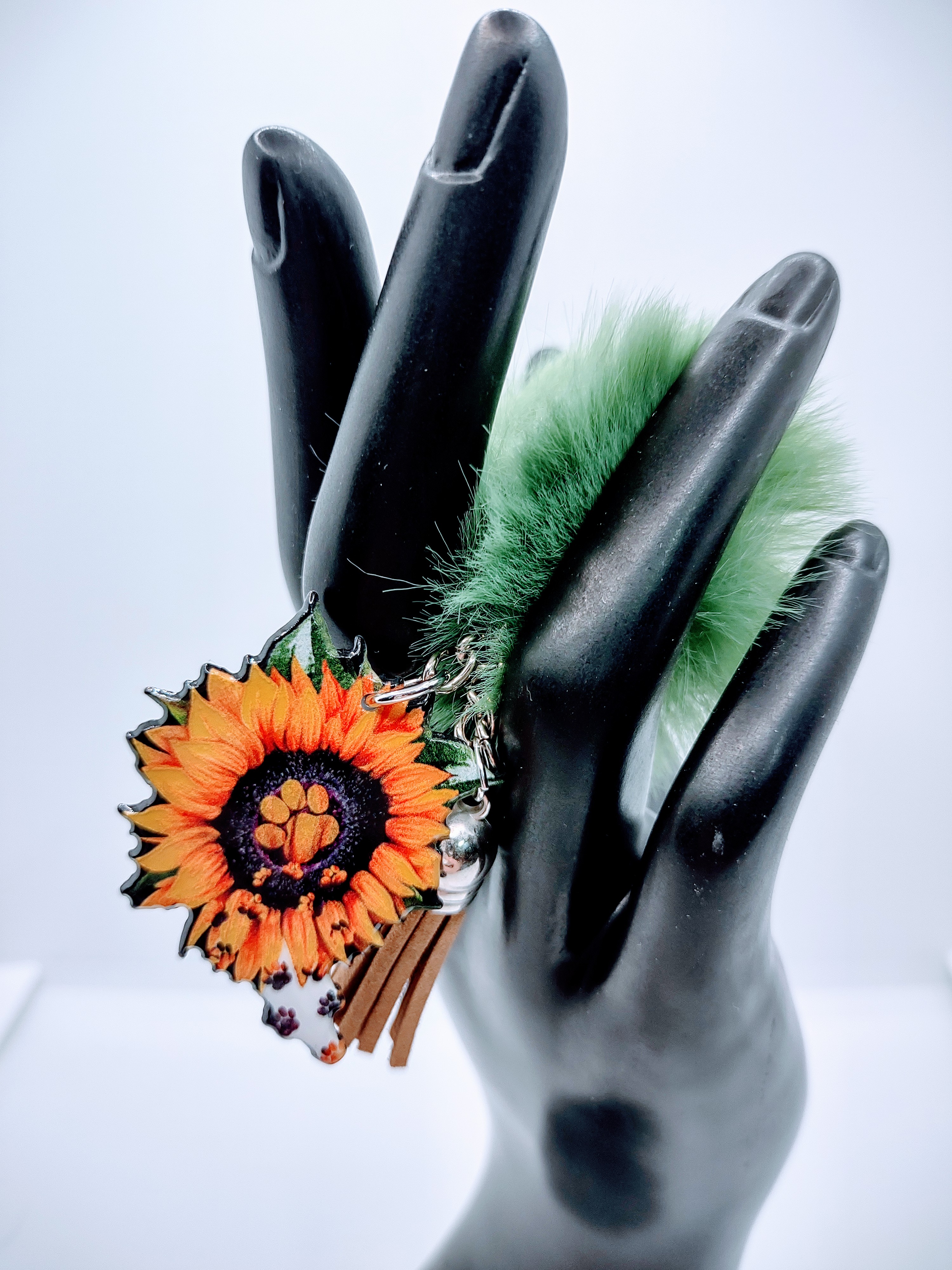 Crafted with high-quality faux fur and featuring a vibrant sunflower design, this keychain is guaranteed to turn heads. The delicate tassels add a touch of elegance, while the acrylic construction ensures durability. The sunflower motif brings a touch of nature-inspired charm, making it an ideal accessory for any season. Please note that the fur color may vary slightly upon delivery due to availability, adding a touch of unique character to each piece.