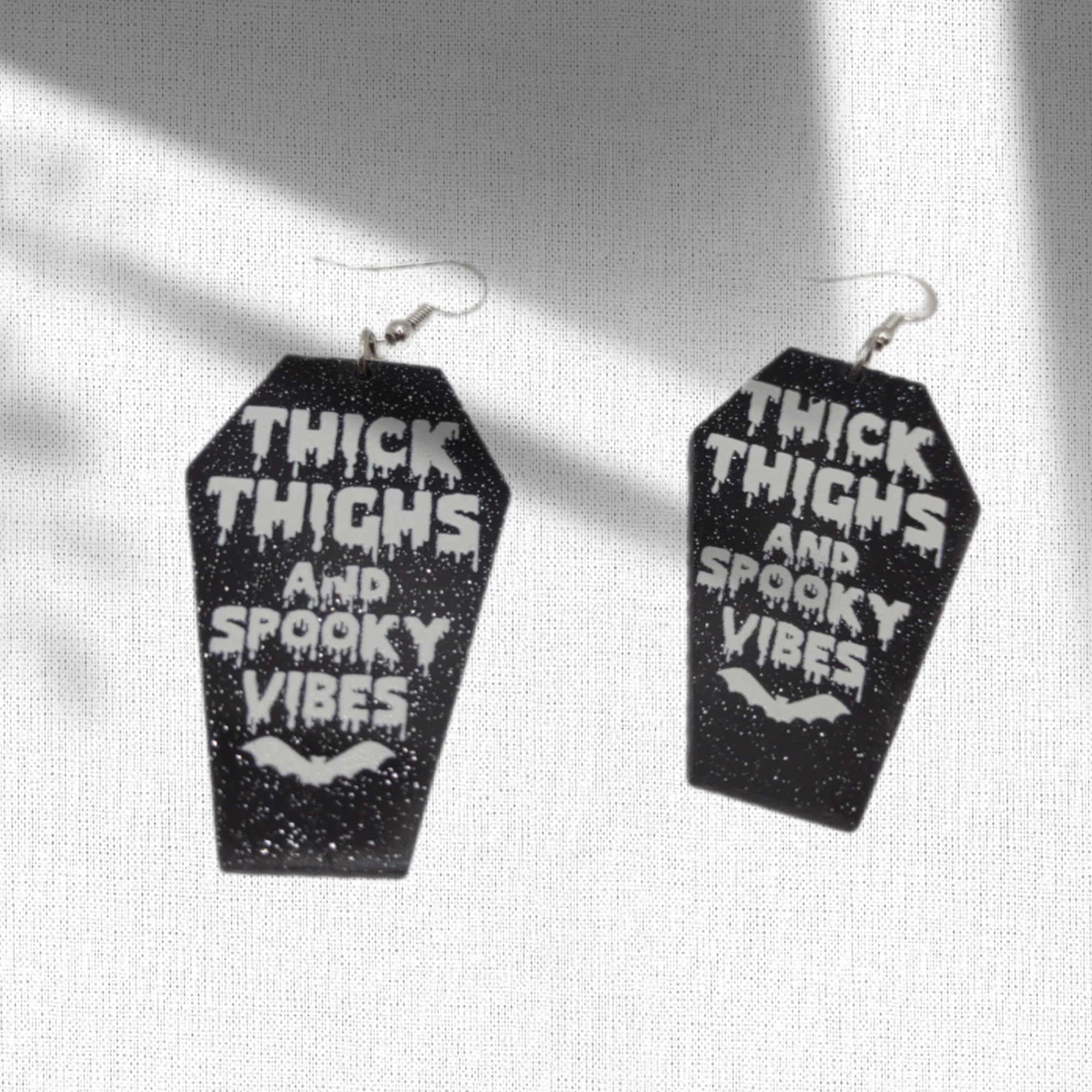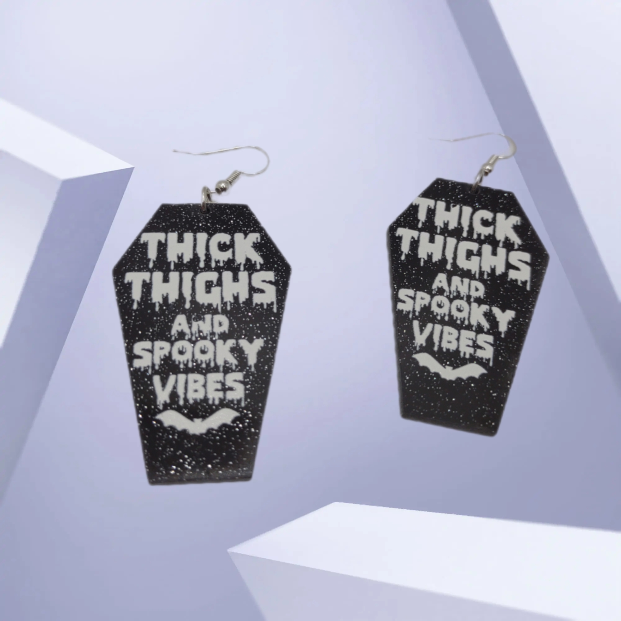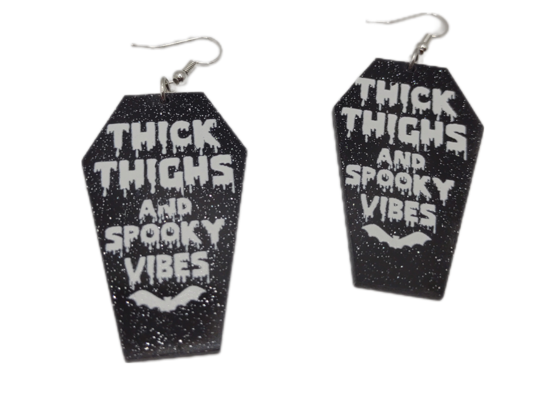 Dare to be different with these Spooky Vibes coffin-shaped acrylic earrings. A perfect blend of sass and spookiness, these statement earrings are designed for those who embrace their unique style and love to make a bold statement. Featuring the playful phrase "Thick Thighs and Spooky Vibes", these earrings add a touch of edgy charm to any outfit.