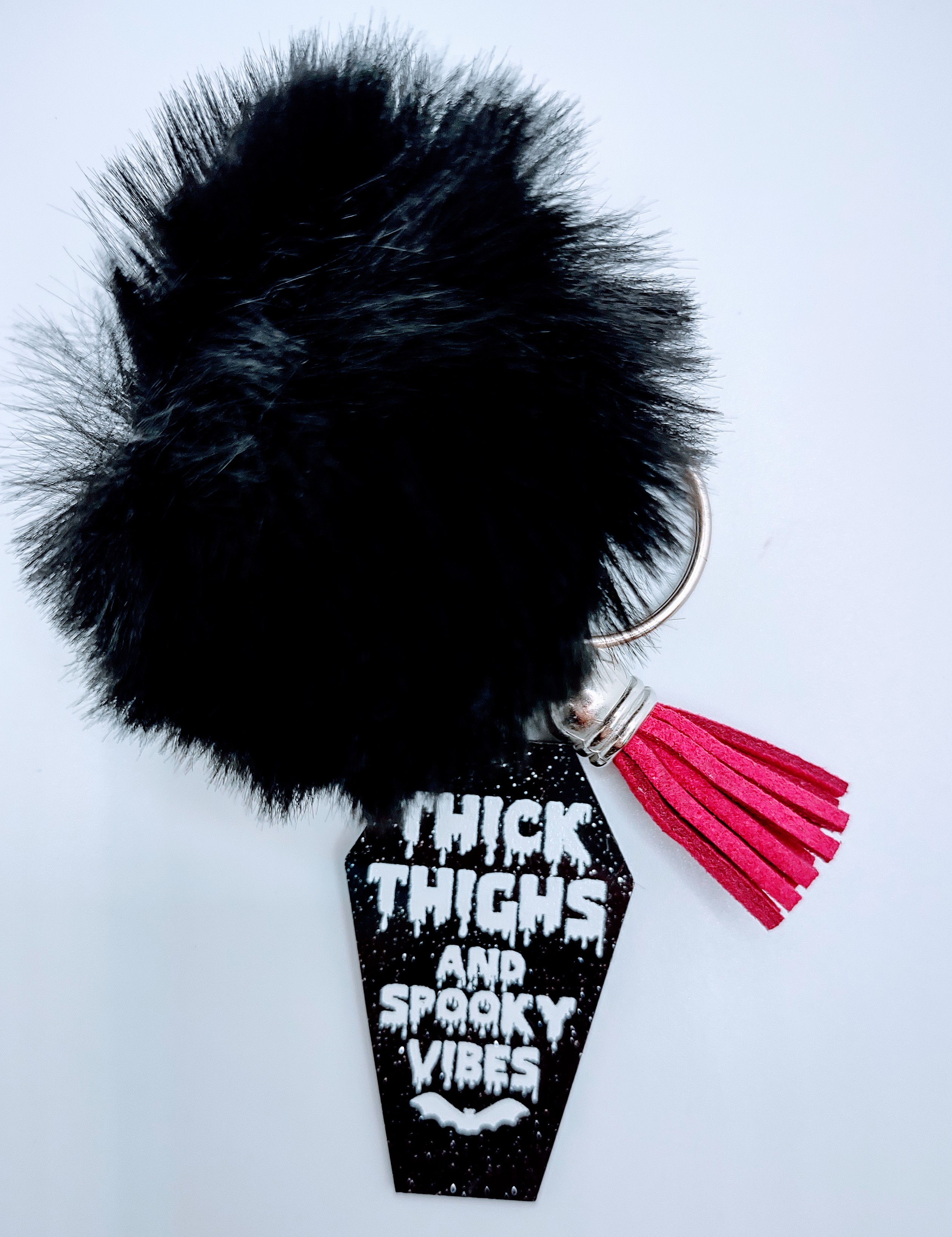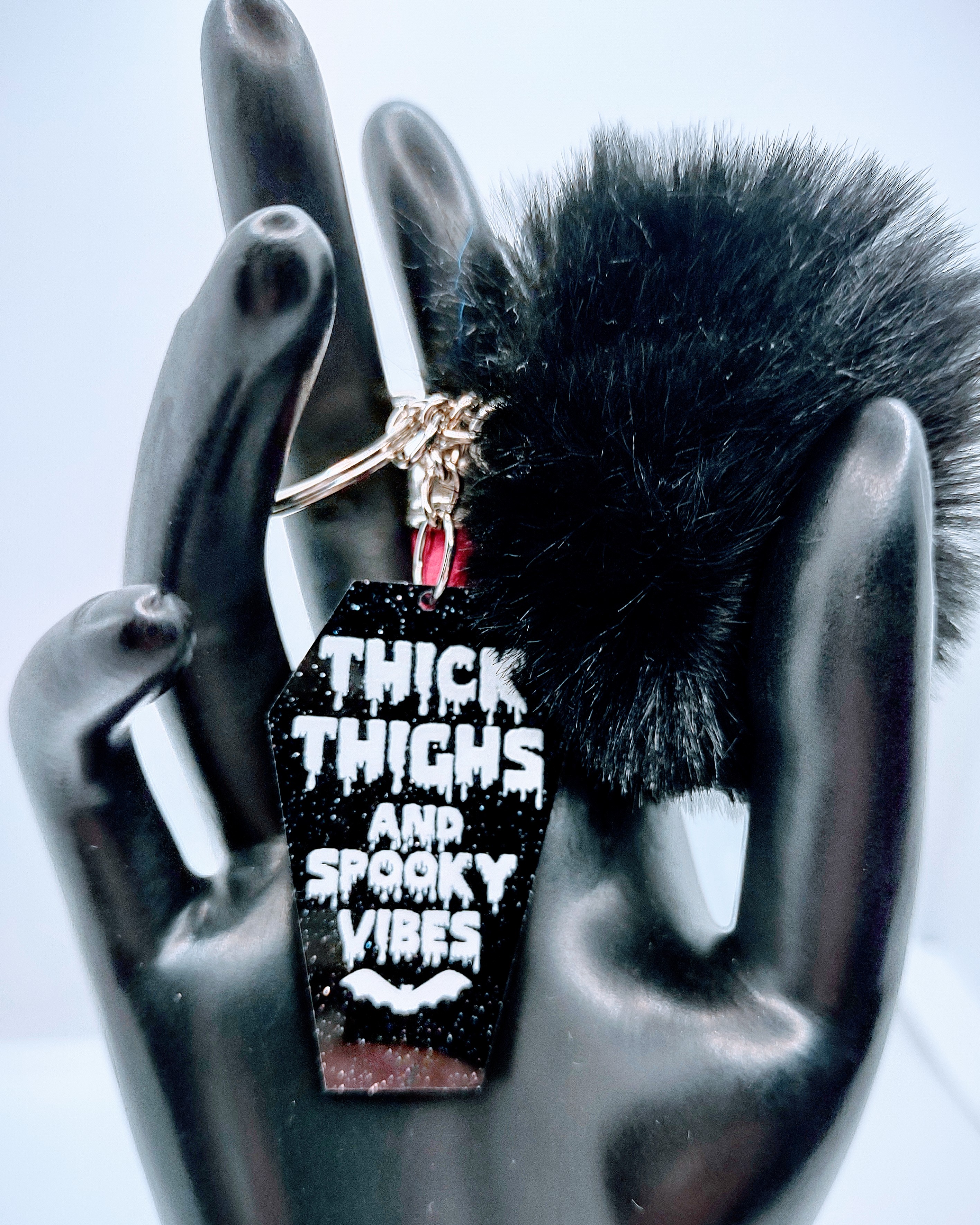 Embrace your spooky side with the unique and stylish Vibes Coffin Shaped Acrylic Keychain. This eye-catching accessory is perfect for adding a touch of dark glamour to your everyday carry. Crafted from high-quality acrylic, this keychain features a distinctive coffin shape emblazoned with the playful phrase "thick thighs and spooky vibes." The addition of a soft fur and tassel charm elevates this keychain from simple to statement-making.