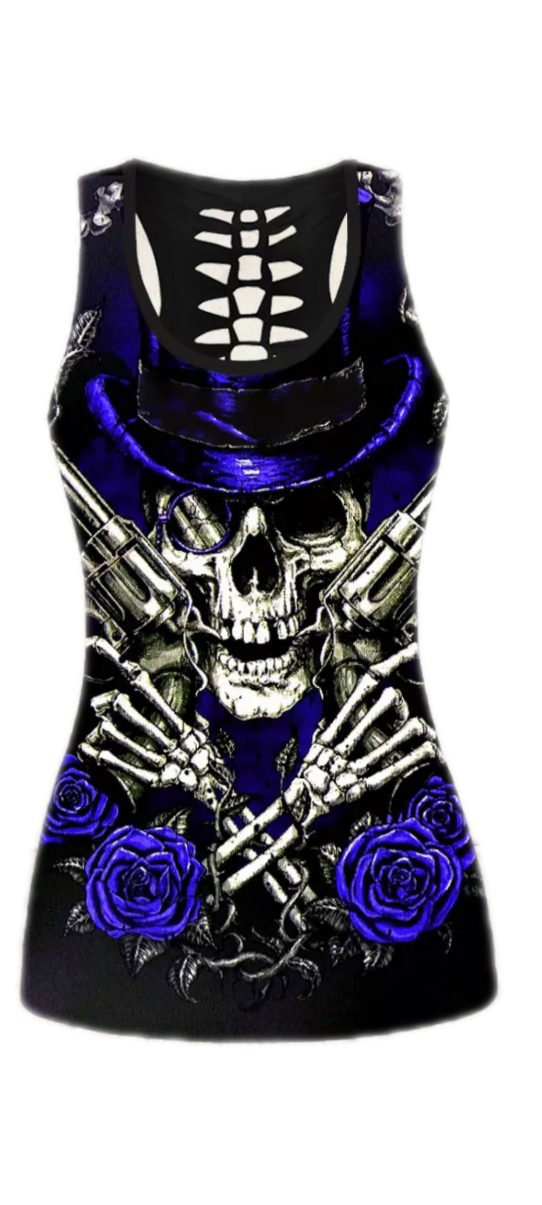 Ready to add a touch of edgy style to your wardrobe? Click "Add to Cart" now and experience the perfect blend of comfort and unique design with the Vibrant Blue Top Hat Skeleton with Double Pistols Ladies Tank!